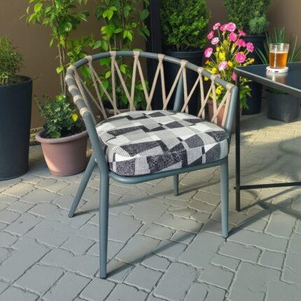This chair features geometric rope weaving along the backrest and arms, paired with a soft cushioned seat for a premium