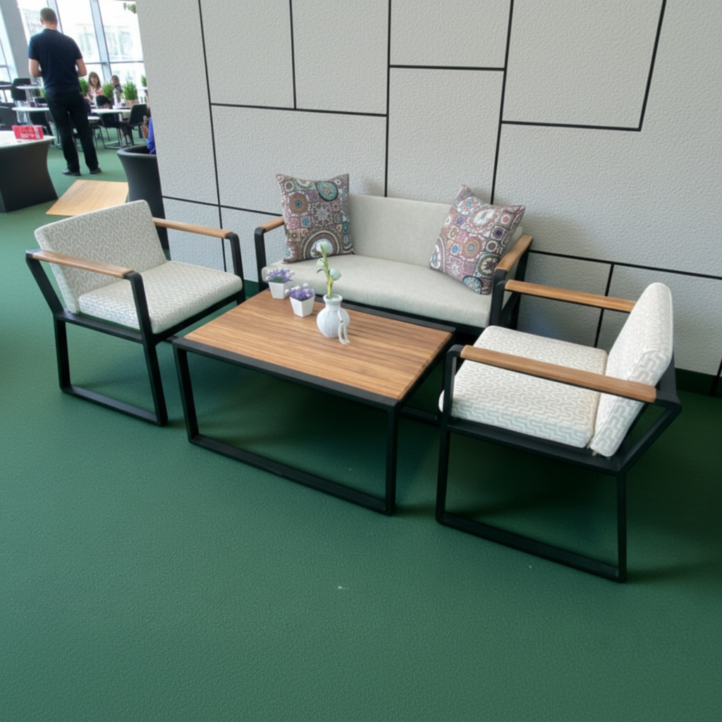 A stylish and compact seating set perfect for cafés, terraces, and indoor–outdoor reception areas. It features two cushioned armchairs and a matching loveseat, all with black frames and natural wood tabletops. Designed for comfort, durability, and elegant simplicity.